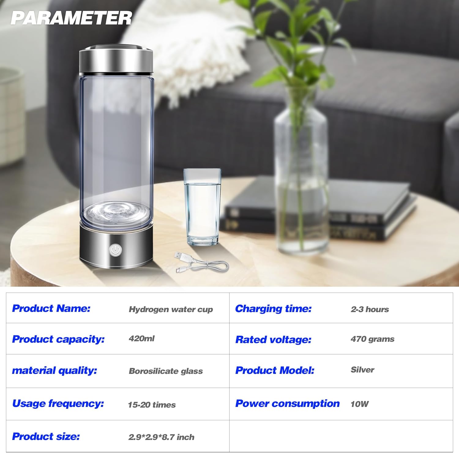 - Simple and stylish design: The bottom of the hydrogen water bottle is equipped with a soft EVE pad, which is stable and non-slip. The USB design allows you to make hydrogen-rich water anytime, anywhere, suitable for office, exercise, travel and other occasions. The large capacity of 420ml meets your health needs.